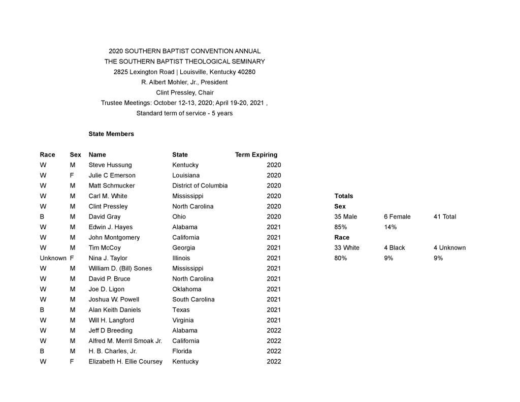 This unanimous vote took place late in the year 2020. I want to inform the reader if you’re still with me at this point, what the makeup of the Southern Baptist Theological Seminary’s Board of Trustees looked like that year.