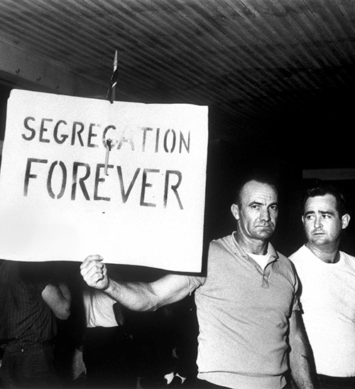 Youths holding signs shouting about segregation now, tomorrow, and forever.