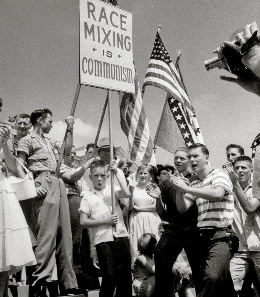 Youths and parents shouting at Black kids as they integrate previously segregated schools. Spitting on them with the crowds’ support.